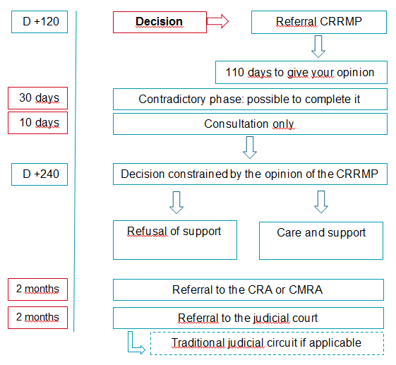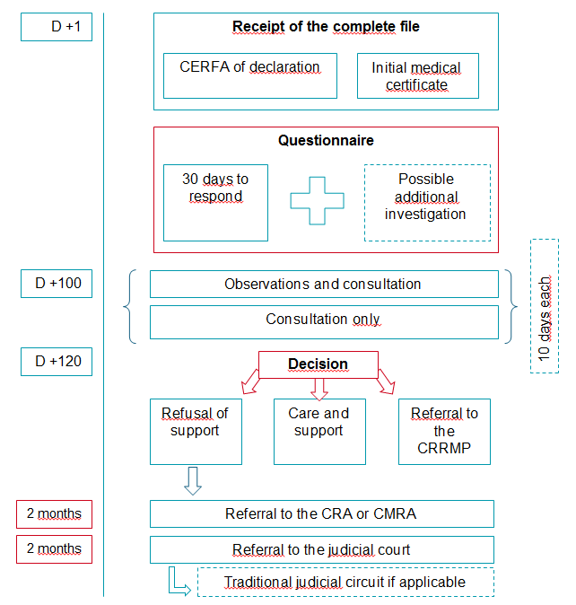 The fund is given an initial period of 120 clear days to rule on the occupational nature of the disease or to refer the matter to the CRRMP (in principle, only for diseases ‘outside the table’ or when all the conditions set out in a table are not fully met).