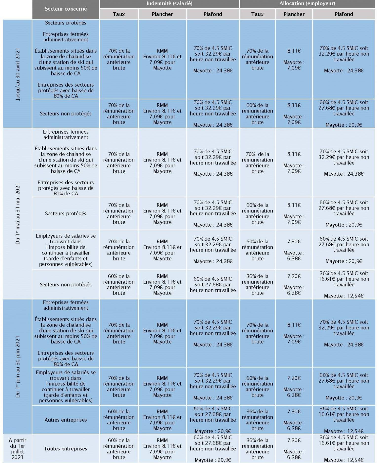 Par ailleurs, le décret n°2021-348 du 30 mars 2021 relatif aux taux de l'allocation d'activité partielle revoie les modalités de la modulation de l'indemnité et de l'allocation d'activité partielle et modifie la liste des secteurs visés par les taux modulés.