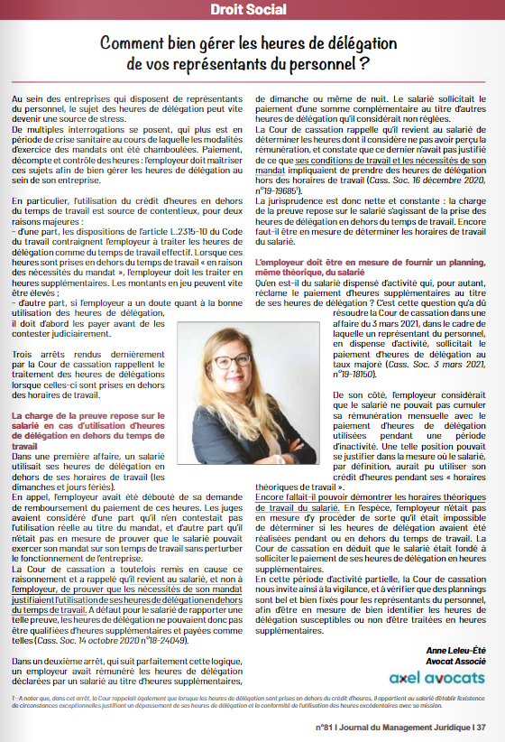 Notre cabinet a été cité dans le Journal du Management Juridique (numéro 81). Retrouvez notre article soit en cliquant sur le lien ci-après : https://fr.calameo.com/read/0000001787fc6269f54b7?page=37, soit en cliquant sur l'image ci-dessous :
